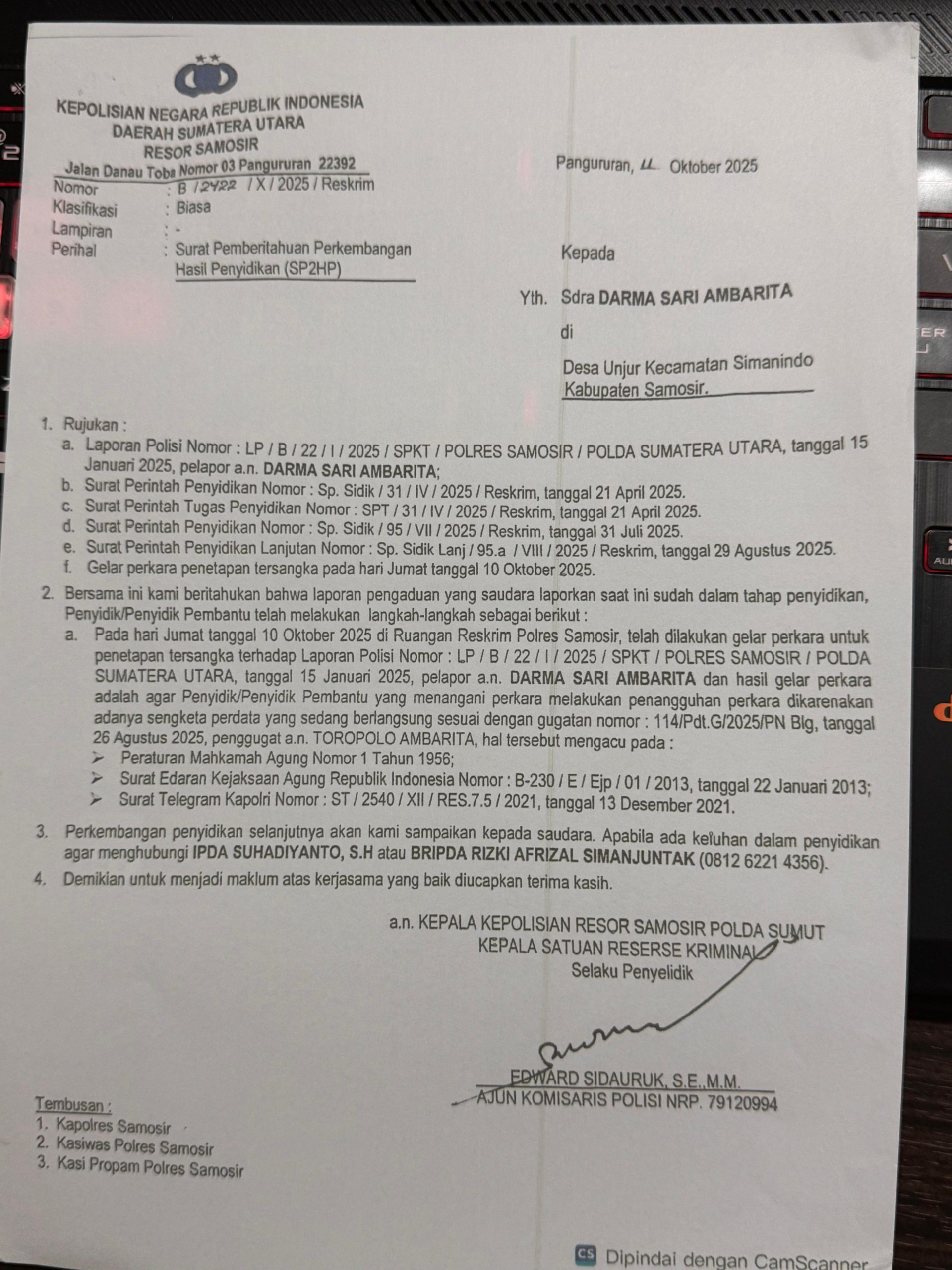 wartanusantara.com,SAMOSIR- Proses hukum atas kasus pengerusakan yang dilaporkan oleh Darma Sari Ambarita di Polres Samosir pada 6 Januari dan 15 Januari 2025, kini menjadi sorotan tajam. Kuasa hukum korban menduga keras adanya intervensi atau ketidakmengertian hukum oleh jajaran Polres Samosir setelah secara tiba-tiba mengeluarkan surat penangguhan proses hukum pada Oktober lalu. Selasa,2/12/2025.