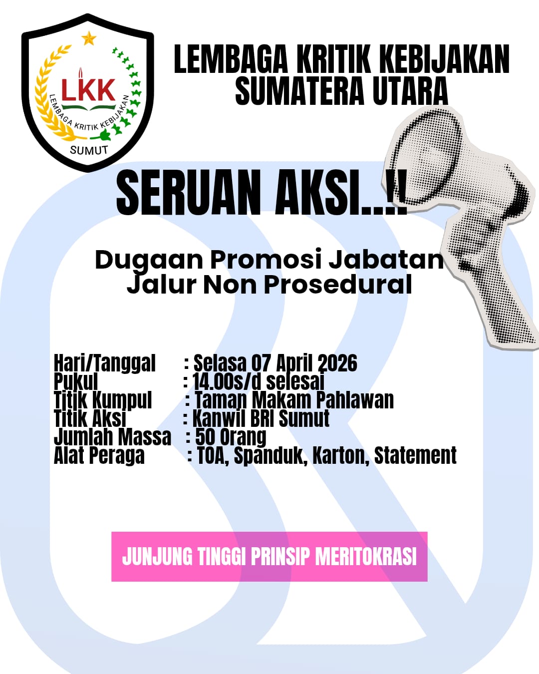 Warta Nusantara | Medan – Lembaga Kritik Kebijakan (LKK) Provinsi Sumatera Utara akan menggelar aksi unjuk rasa pada Selasa, 7 April 2026, sebagai bentuk protes terhadap dugaan praktik promosi jabatan non-prosedural di lingkungan Bank Rakyat Indonesia (BRI) wilayah Sumatera Utara.