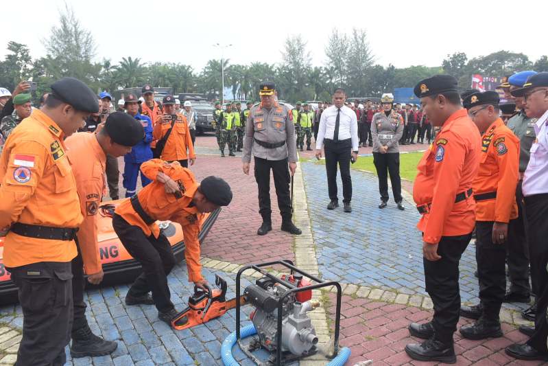 Usai apel, Kapolresta dan Wabup bersama unsur Forum Koordinasi Pimpinan Daerah (Forkopimda) meninjau peralatan dan fasilitas penanggulangan bencana yang akan digunakan dalam menghadapi potensi bencana hidrometeorologi di wilkum Polresta Deli Serdang
