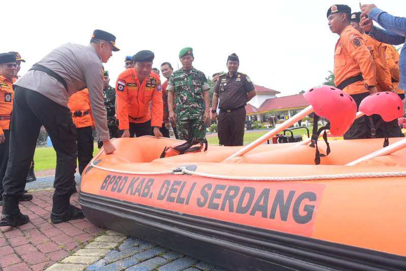 Usai apel, Kapolresta dan Wabup bersama unsur Forum Koordinasi Pimpinan Daerah (Forkopimda) meninjau peralatan dan fasilitas penanggulangan bencana yang akan digunakan dalam menghadapi potensi bencana hidrometeorologi di wilkum Polresta Deli Serdang